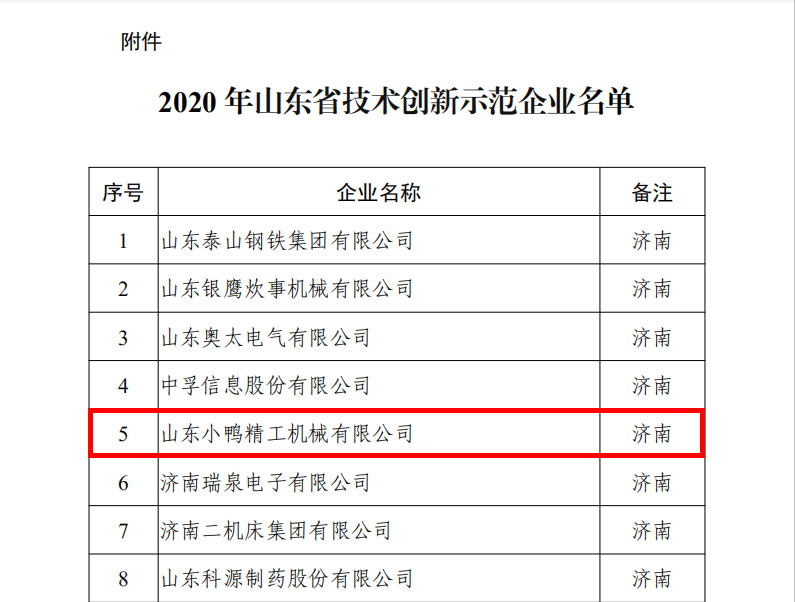 瀏覽量:0近日,山東省工業(yè)和信息化廳發(fā)布2020年山東省技術創(chuàng)新示范企業(yè)名單,山東小鴨精工機械有限公司成功入選。小鴨精工在技術創(chuàng)新領域精耕細作,持續(xù)的研發(fā)投入和體系優(yōu)化,用技術創(chuàng)新驅(qū)動產(chǎn)業(yè)發(fā)展,公司技術研發(fā)實力不斷提升,為省級技術創(chuàng)新示范企業(yè)的申請成功奠定了基礎。